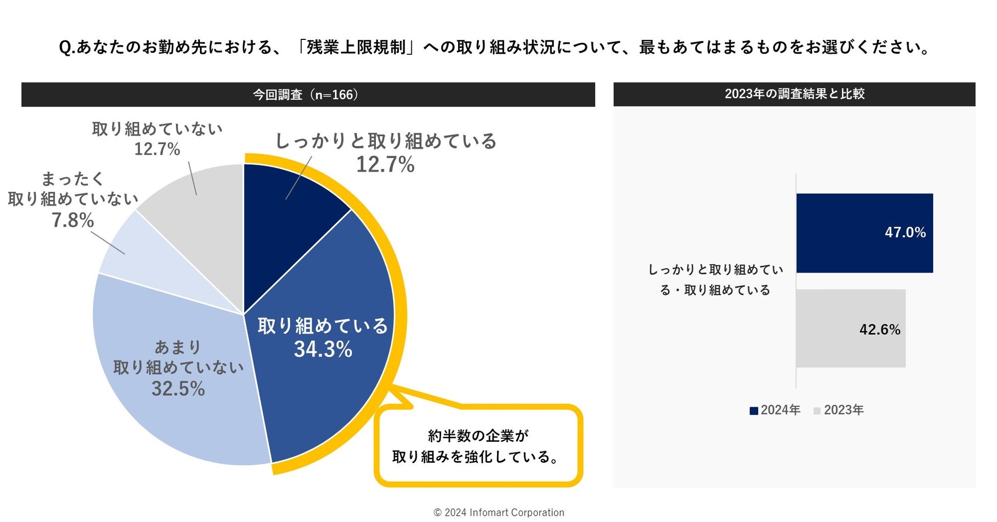 今年4月開始の「働き方改革関連法」の1つである「残業時間の上限規制」について、勤め先での取り組み状況を聞いたところ(n=166)、47%が「しっかりと取り組めている」「取り組めている」と回答しました。2023年の42.6%と比較すると、やや増加しています。