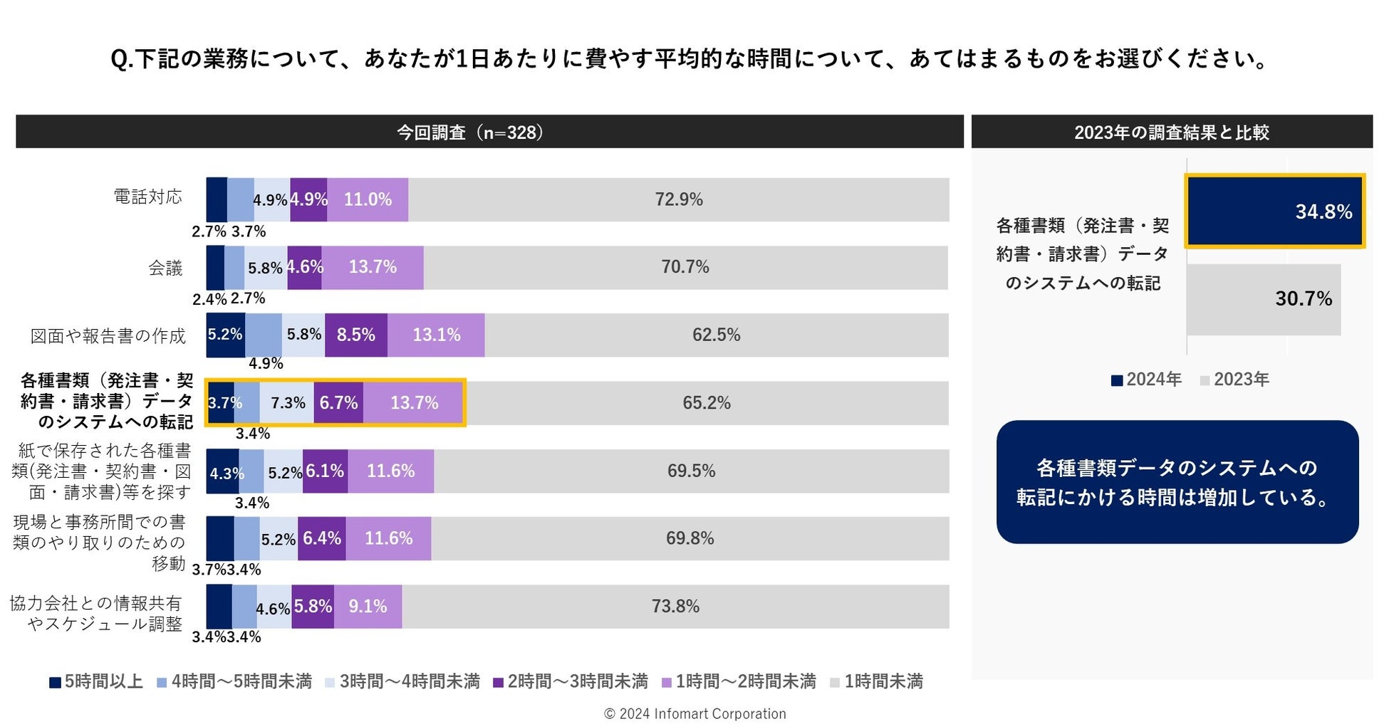 各種業務にかけている1日あたりの時間を聞いたところ(n=328)、34.8%が「各種書類(発注書・契約書・請求書)データのシステムへの転記」に1時間以上かけている結果となりました。2023年の30.7%と比較して、増加していることがわかりました。