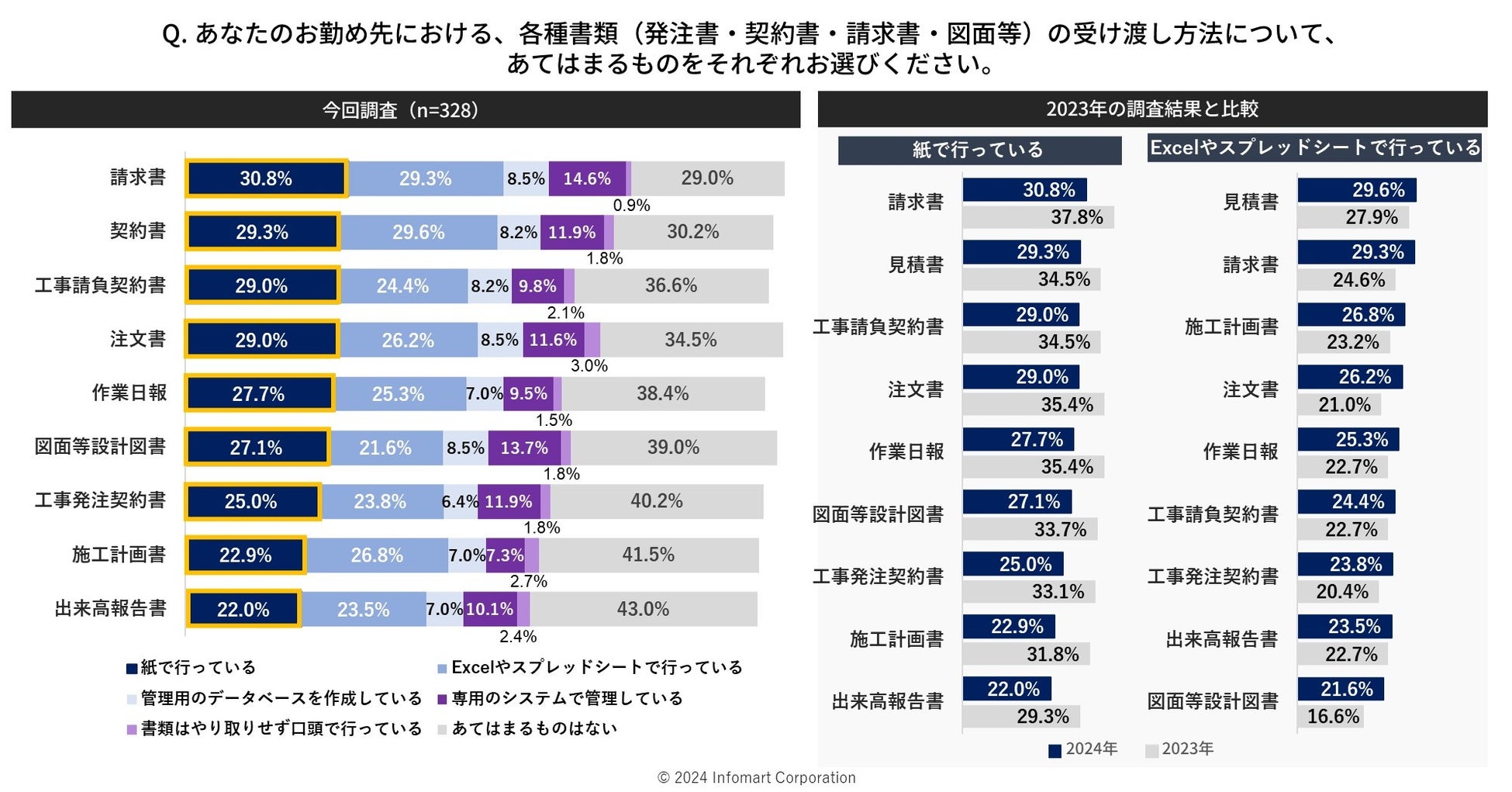 各種書類(発注書・契約書・請求書・図面等)の受け渡し方法、昨年調査時から「紙」が減少するも、「Excelやスプレッドシート」が増加傾向に
