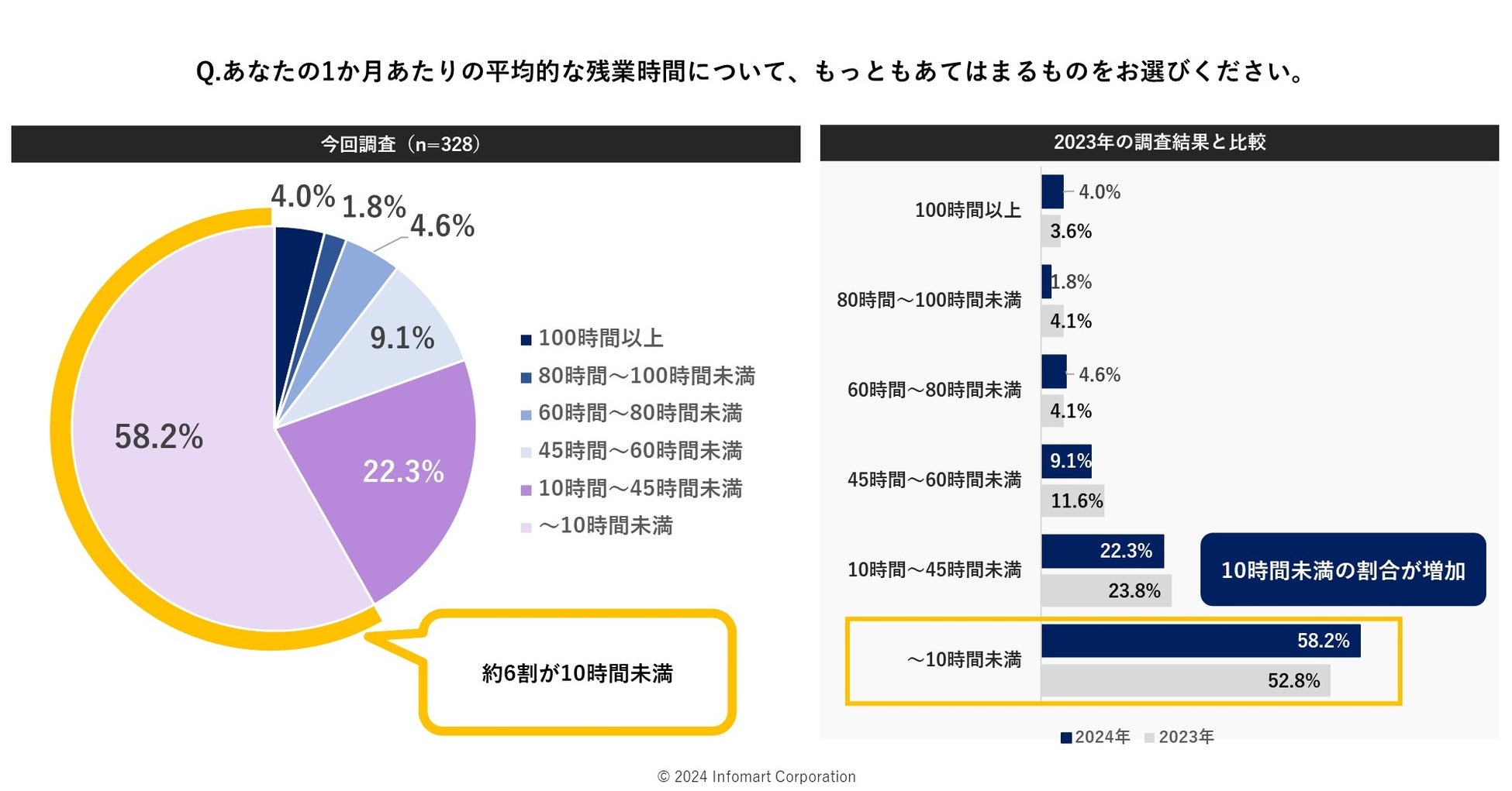1か月の平均的な残業時間を聞いたところ(n=328)、58.2%が「10時間未満」で最多となりました。「10時間未満」と回答した割合は、2023年調査時の52.8%よりも増加しており、ペーパーレス化やその他の業務の電子化が促進され、残業時間も減少傾向にあると推測できます。