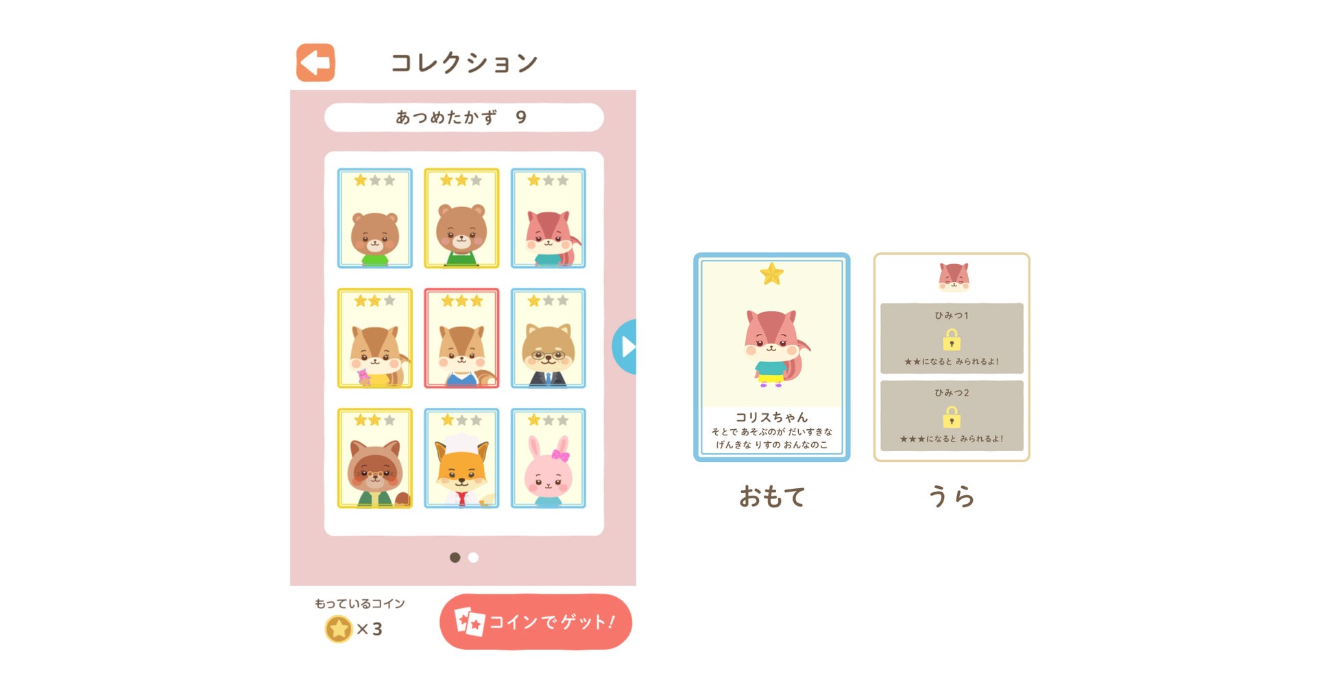 集めたコインは、お話に登場するかわいい動物たちの「おたすけカード」と引き換えることができます。たくさん集めてコレクションしましょう。 |