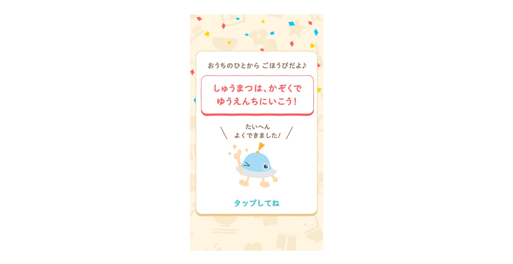 登録された全ての「やること」を終わらせたら、「やることミッション」クリア。「おたすけたい」のエンディングストーリーが、お子さまに達成感を与えます。 |