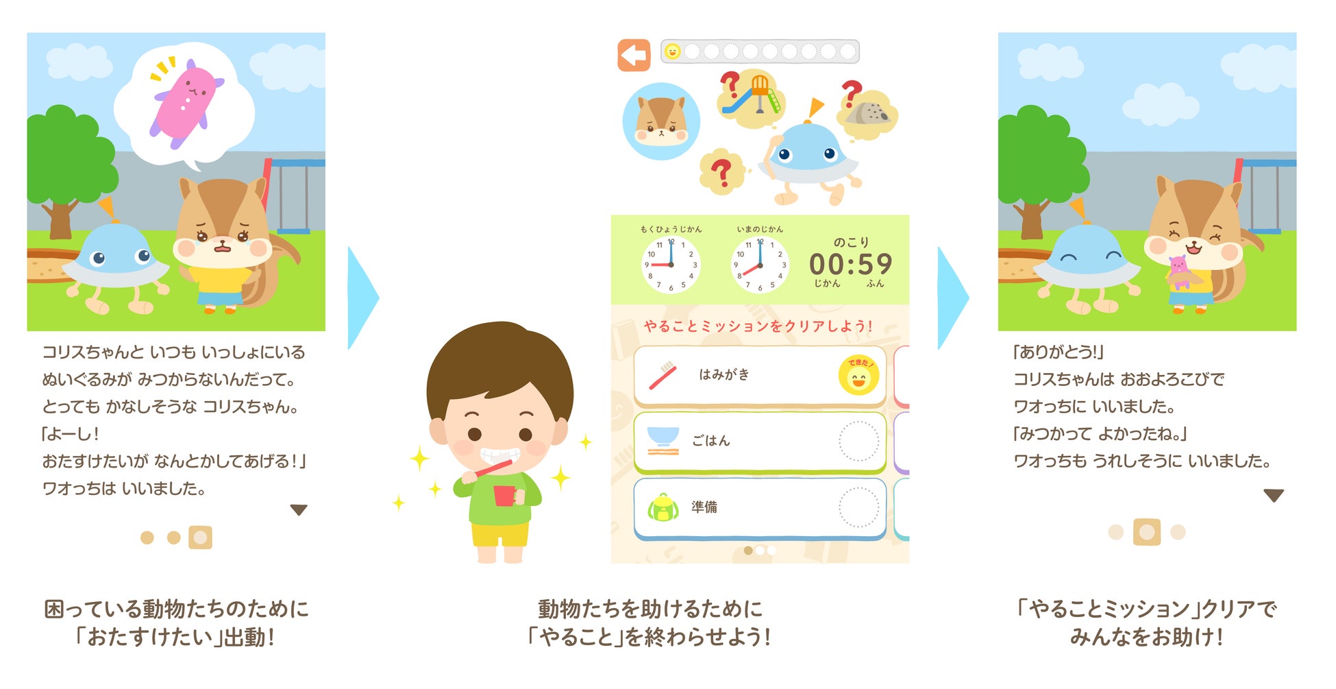 登録した時間になると、アプリ内のキャラクターが「やることミッション」を開始するように促してくれます。お子さまが「やることミッション」に取り組むことで、困っている動物を助けられるという「おたすけたい」のオープニングストーリーが、お子さまのやる気を引き出します。 |