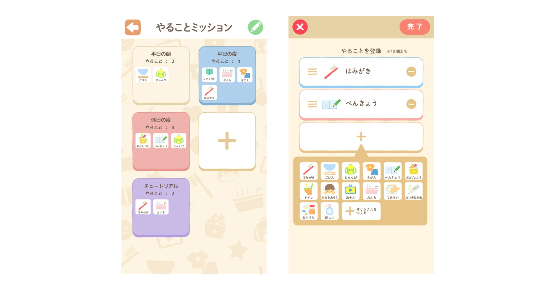 歯磨きやお片付けなど、時間を守ってやってほしいことを簡単に登録できます。登録する「やること」はオリジナルで作ることもできるので、各家庭に合わせてカスタマイズが可能です。