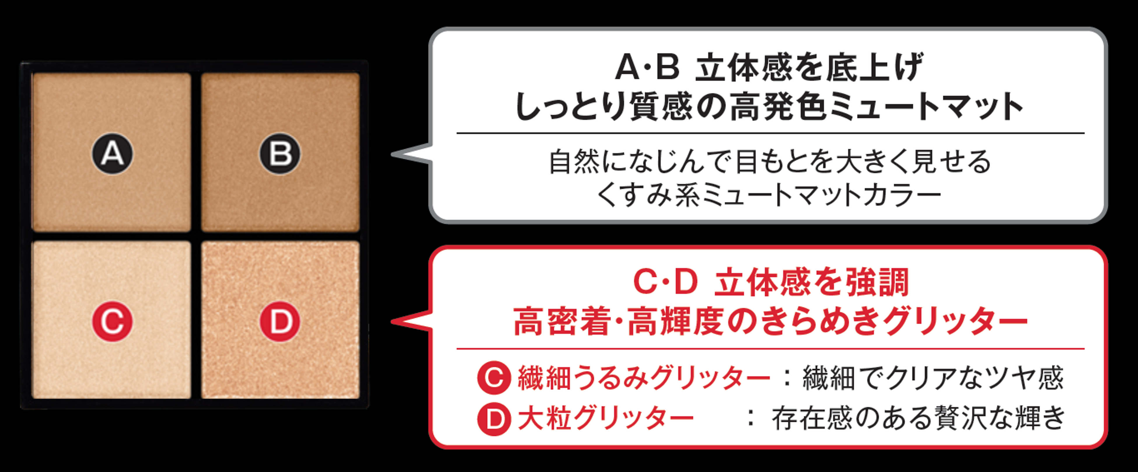 ①簡単にクリっと丸い目もと印象に仕上がる秘密は、質感差!カラーではなく、質感の差で立体感を引き立てます。