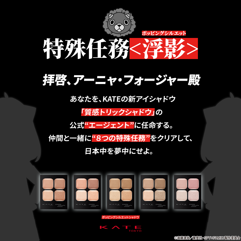 ミュートマット×きらめきグリッターの質感トリックで、アーニャのような、クリっとした目もと印象に仕上がる「ケイト ポッピングシルエットシャドウ」の全貌を解明するとともに、全問正解で豪華プレゼントがもらえる8つの特殊任務<浮影>がスタートします。
