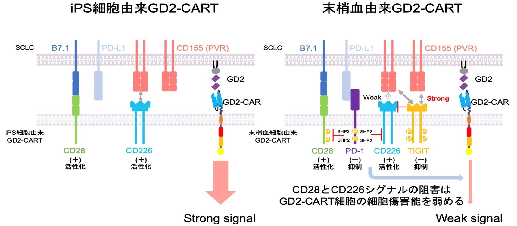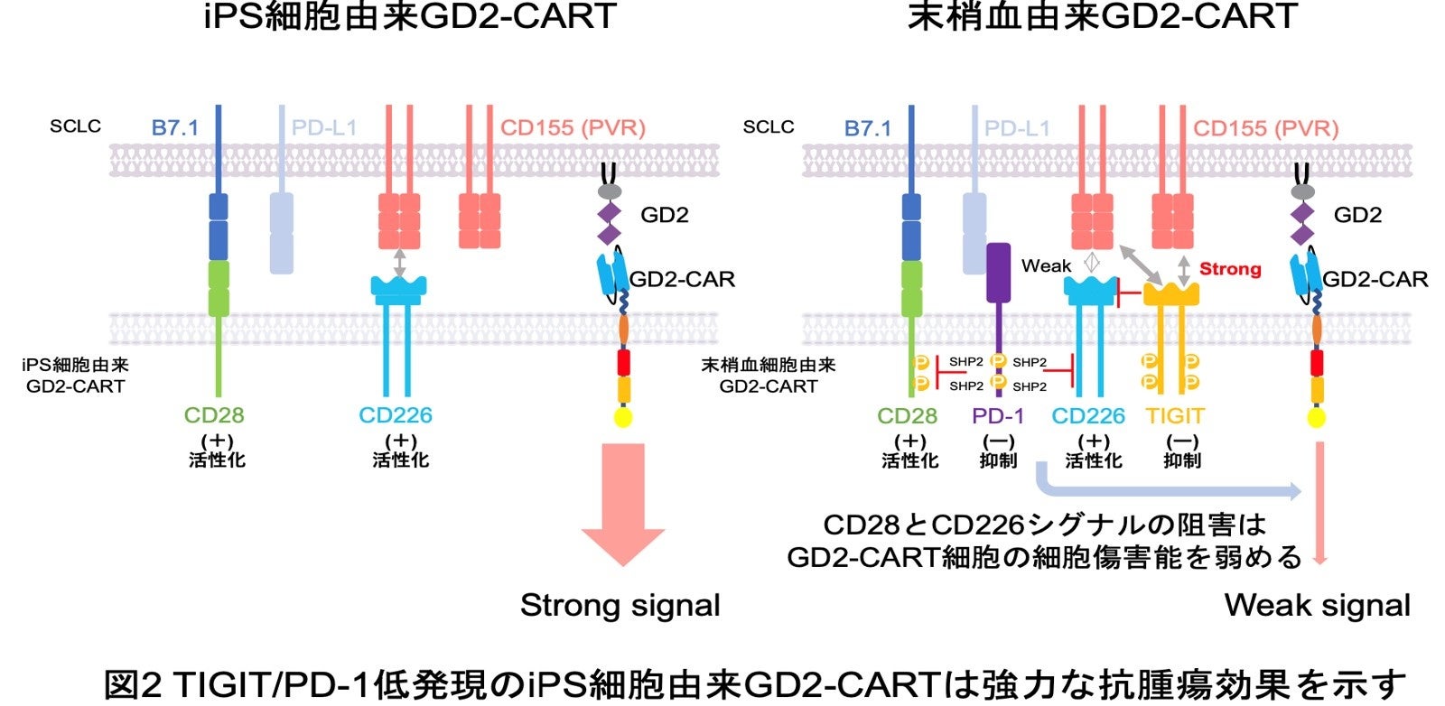 T細胞表面に発現するCD226は、腫瘍細胞表面に発現しているCD155と結合することでT細胞を活性化し、抗腫瘍効果を発揮します。しかし、TIGITはCD226と比較しCD155に対してより強力な結合能を持つため、TIGITを高発現する疲弊したT細胞は、CD226-CD155結合が上手にできず、抗腫瘍効果を発揮することが出来ません。そのため研究グループは、iPS細胞由来GD2-CART細胞ではTIGIT発現レベルが末梢血由来GD2-CART細胞に比較して有意に低いため、小細胞肺がんに対して高い抗腫瘍効果を発揮できるのではないかと考えました (図2)。