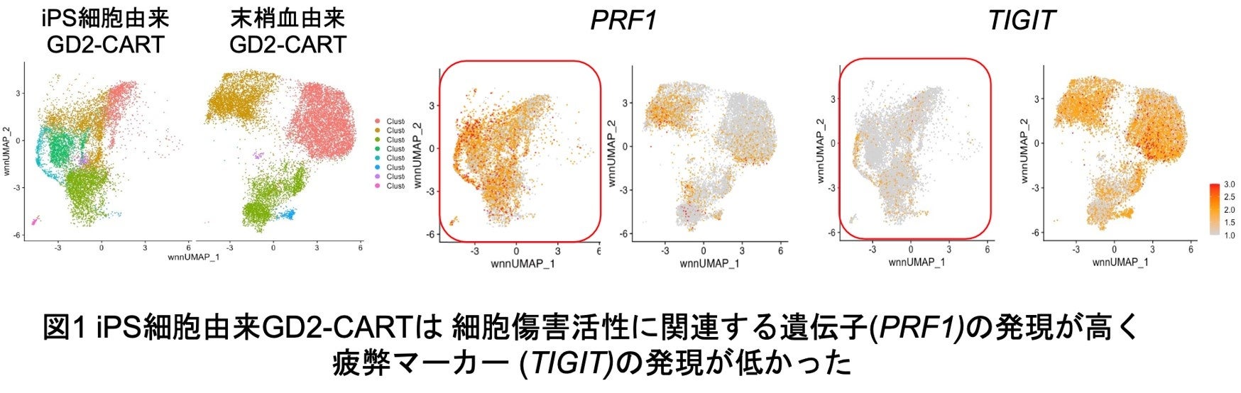 そこで、なぜiPS細胞由来GD2-CART細胞が末梢血由来GD2-CART細胞と比較して、小細胞肺がんに対する強力な抗腫瘍効果を有しているかを解明するためにシングルセル解析をおこないました。シングルセル解析では、1細胞毎の遺伝子発現と細胞表面抗原発現を網羅的に確認できます。iPS細胞由来GD2-CART細胞は末梢血由来GD2-CART細胞と比較して、細胞傷害活性に関する遺伝子 (PRF1, GZMB, IFNG)の発現レベルが高く、免疫シナプスの形成に関与する遺伝子(ITGAL, CD18, CD44, PTPRCなど)の発現レベルも高いことがわかりました。