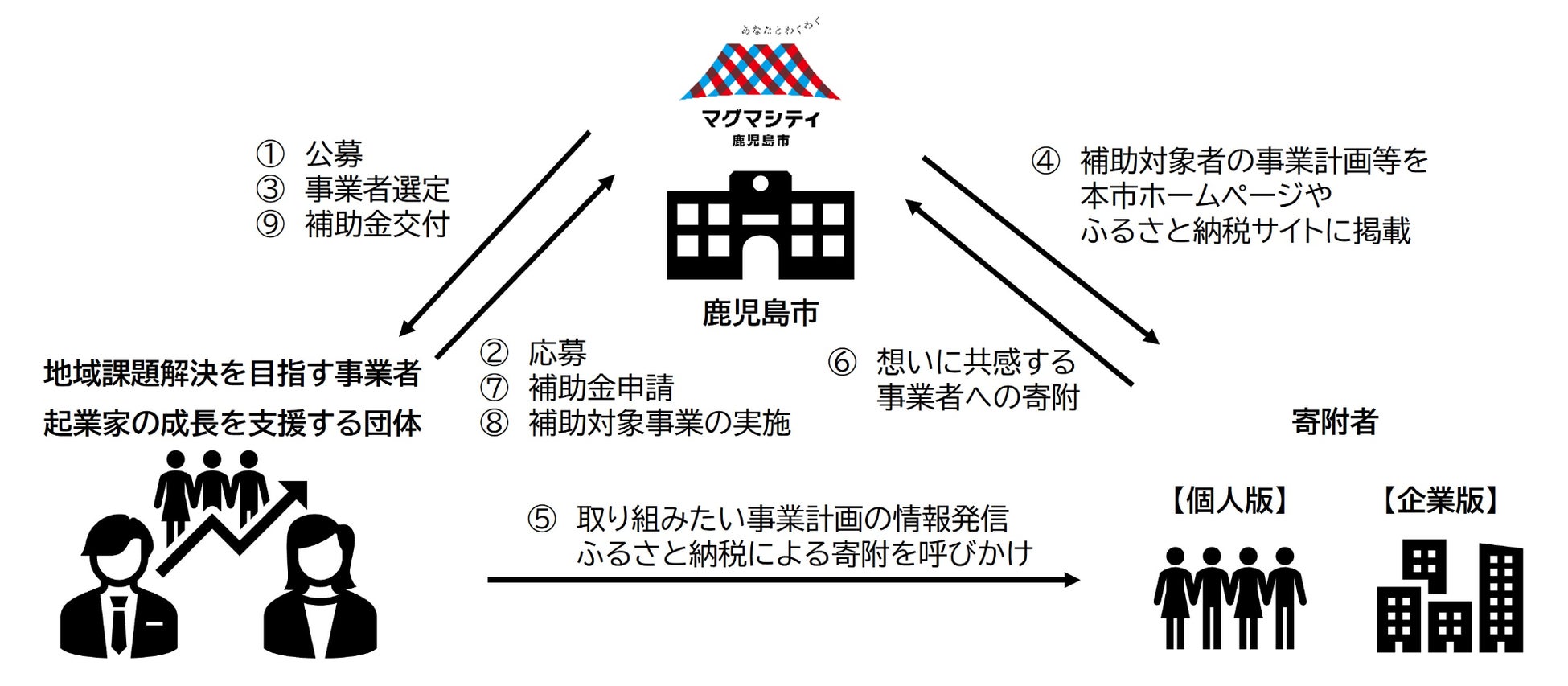 ビジネスによる地域課題解決の促進や起業家支援の更なる充実を図るため、ビジネスの手法を用いて地域課題の解決を目指す事業者や起業家の成長を支援する団体の経営基盤の強化にかかる取組に対して、本市のふるさと納税を活用した資金調達の機会を提供し、調達資金を原資とした補助金の交付による支援を行います。「ふるさと納税forGood」では、鹿児島市から採択された全4企業を指定して寄附することができます。