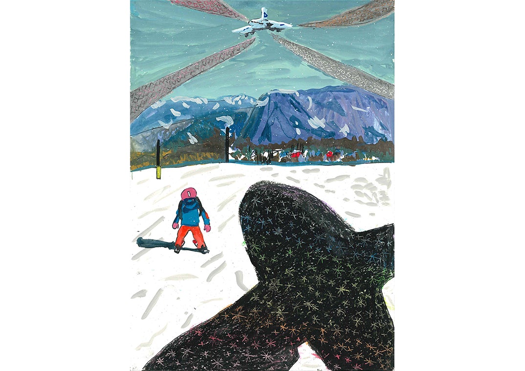雪の上に飛行機の影が映っている瞬間を捉え描いてくれました。奥の山も、空気が澄んだ、冬の感じが良くでています。影の部分も星のようにキラキラと雪の粒が光っていて模様も素晴らしいです。