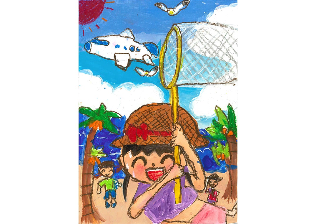 飛行機を捕まえたい!という嬉しそうな少女の表情がとても良いですね。空には飛行機。虫捕りをしていたのか、それとも飛行機を捕まえるために網を持っているのか?すごくイメージの広がる楽しい作品になりました。暑かった夏のことも、この1枚の絵に盛り込まれていると思います。
