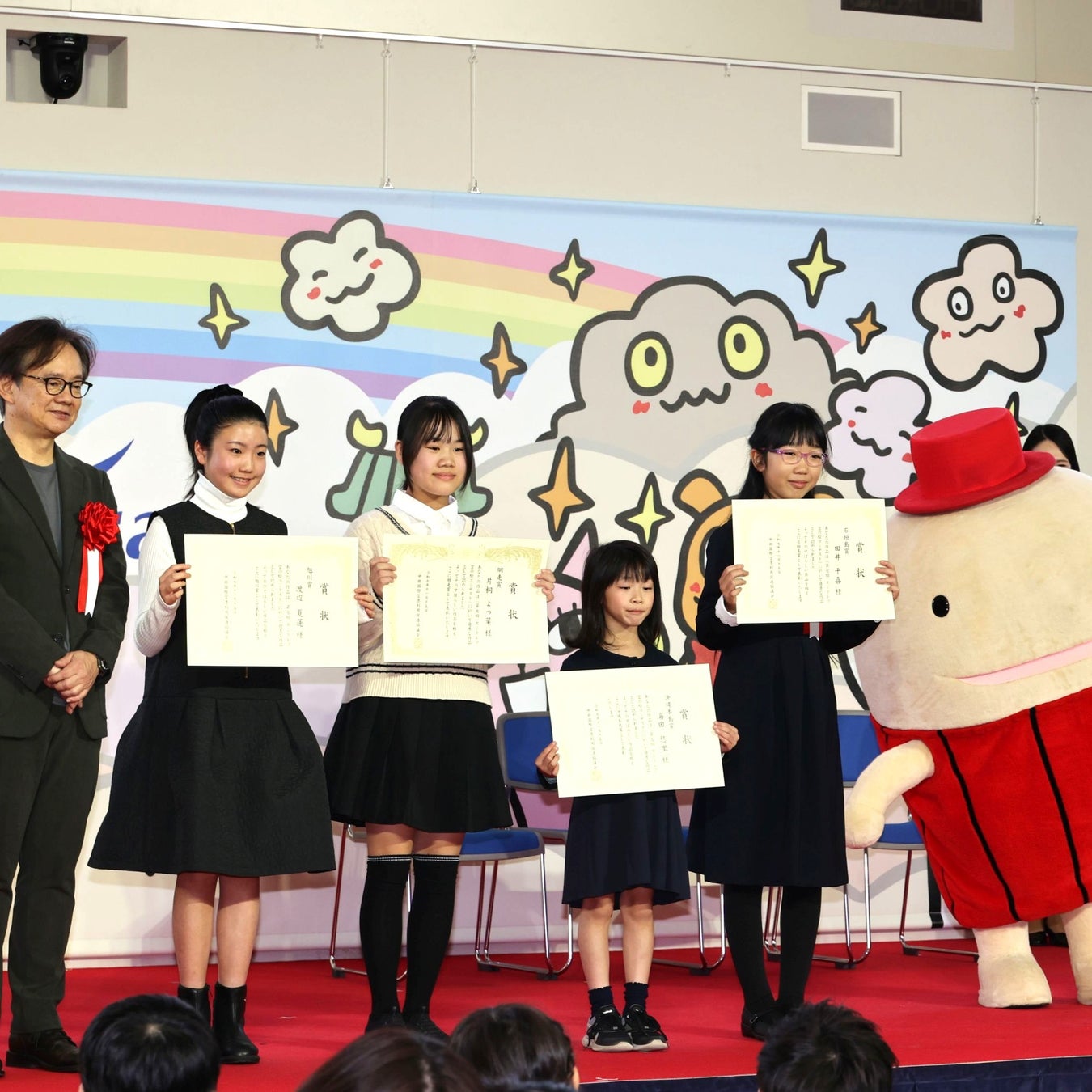 表彰は4つの部門「小学校1・2年部門」「小学校3・4年部門」「小学校5・6年部門」「中学生部門」に分かれて行われ、それぞれの受賞者が壇上で作品の紹介と共に表彰されました。