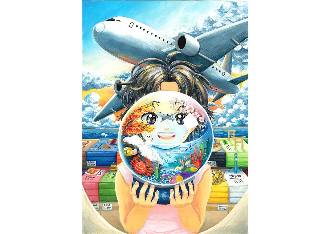 女の子の表情がとても良いですね。楽しい思い出がいっぱいなことが伝わってきます。描写力も、イメージをどんなふうに表現するかというアイディアも素晴らしいです。空港のお店にいろんな思い出が並んでいまるところも良い。審査会では全員であっと歓声を上げながら選んだ作品でした。