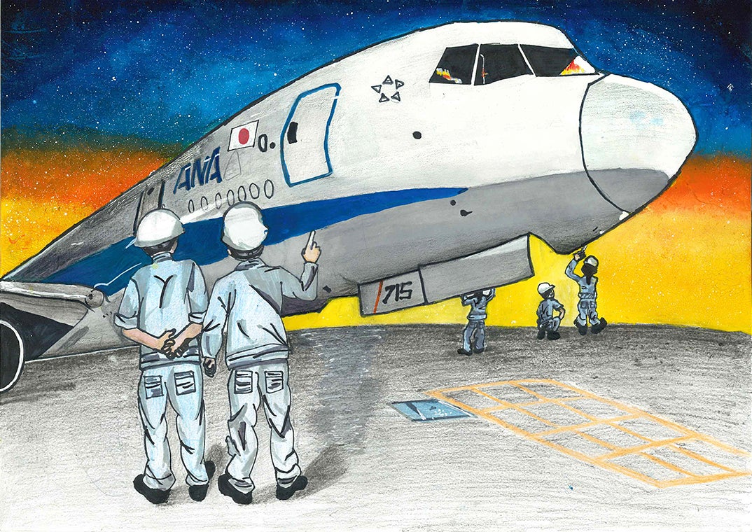 整備士=“飛行機のドクター”に着目。飛行後に戻った機体を整備する様子、夜空の描写、遠近感が優れています。整備に携わっている皆さんも注目してくれたことを喜んでいることと思います。
