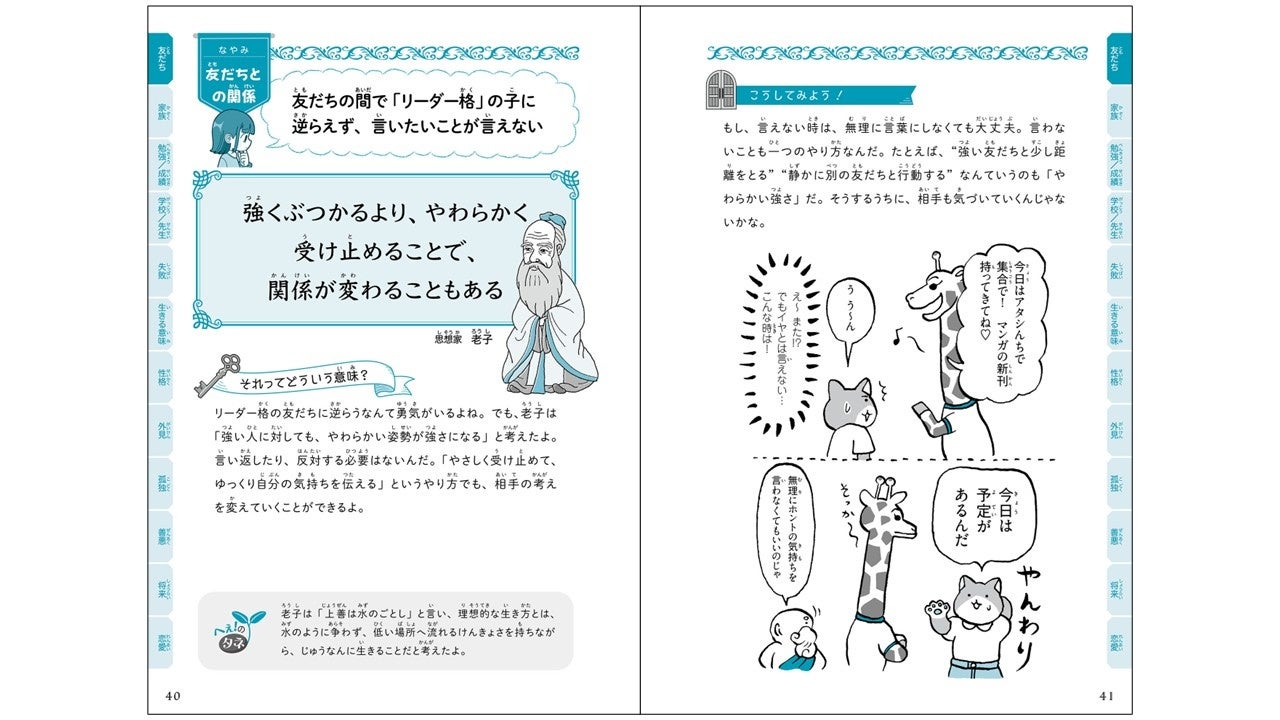 本書は、小学生〜中学生から集まったリアルな悩みへの答えを、哲学者・心理学者の視点から短くわかりやすく届ける「心の辞典」です。新学期や新学年に進級時に特に増える悩みや不安をとりあげ、古今東西の哲学者の言葉を元に考え方のヒントを紹介します。