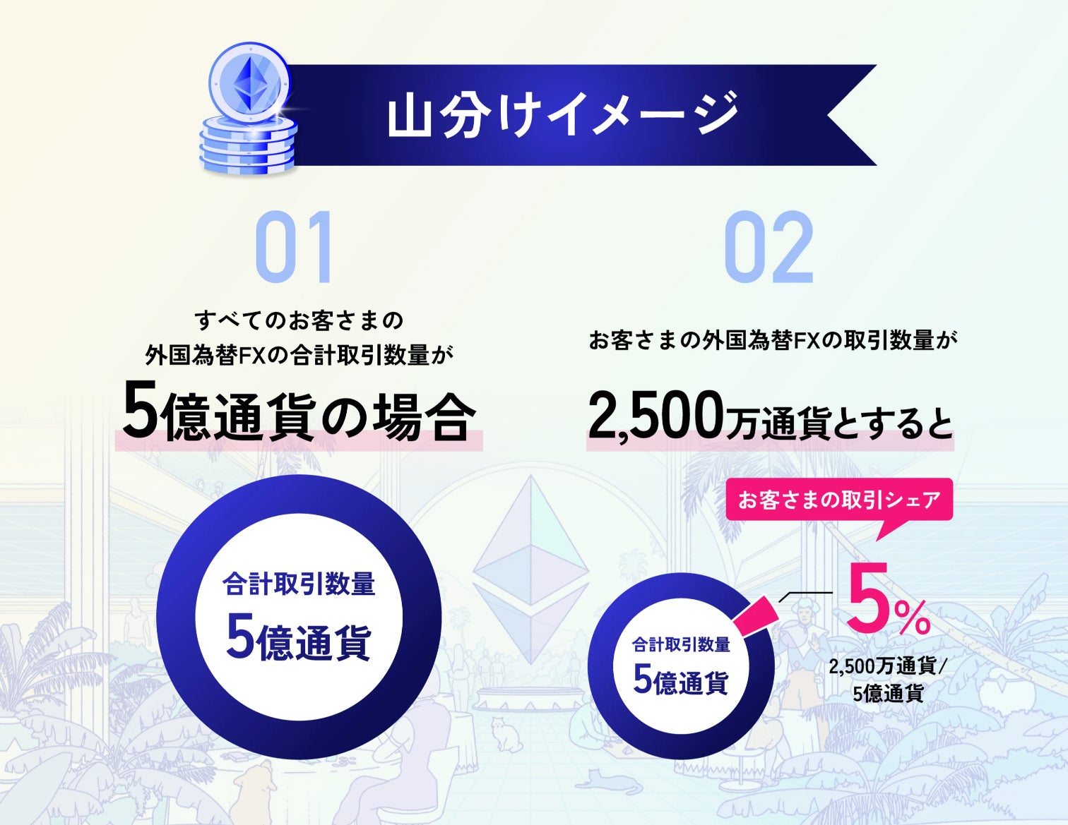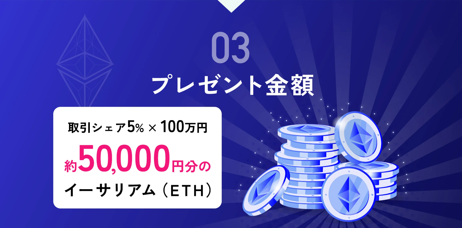 100万円分のイーサリアム(ETH)を期間中のすべてのお客さまの合計取引数量で等分に⼭分けしてプレゼ
