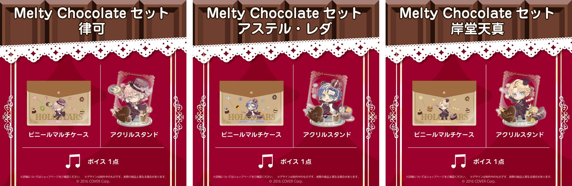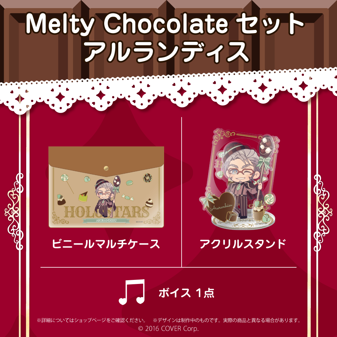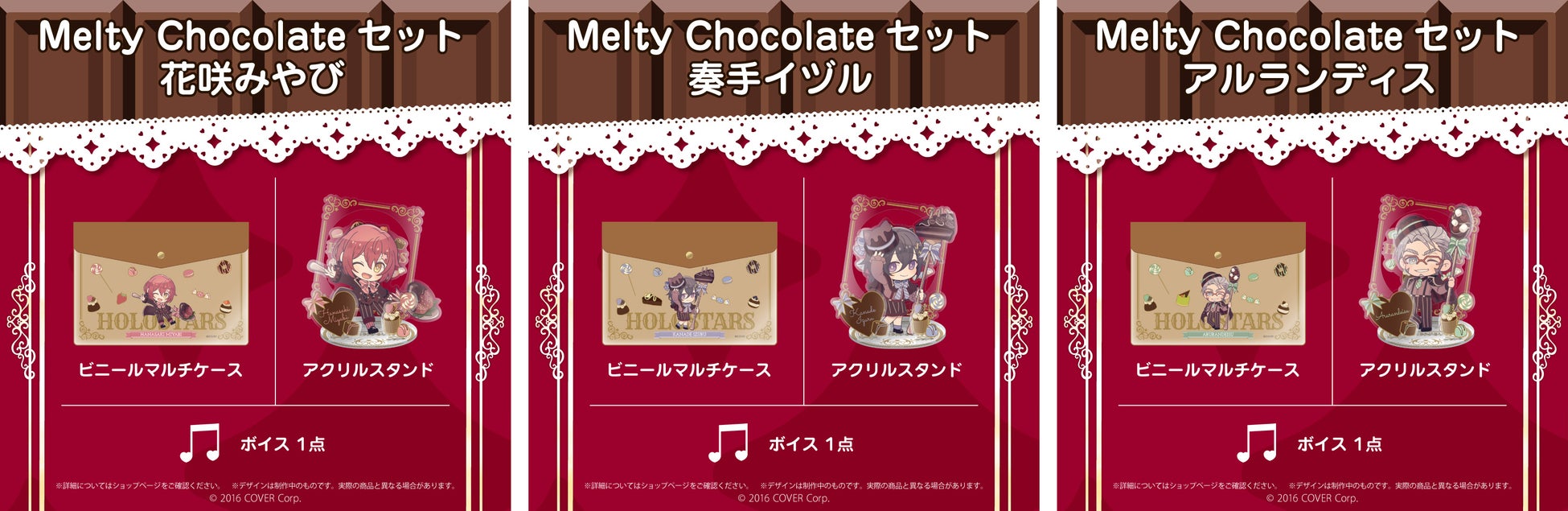 「Melty Chocolateセット」は、「みかんもち」先生描き下ろしのミニキャラクターイラストを使用したアクリルスタンドとビニールマルチケース、そして「ホロスターズ」の各メンバーが"あなた"と2人きりで過ごすバレンタインデーの1日をテーマにしたシチュエーションボイスの3点がセットとなっています。