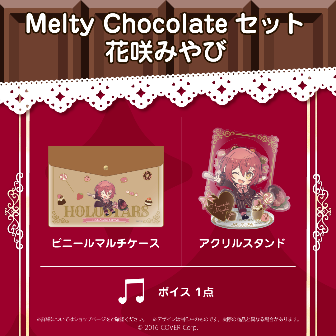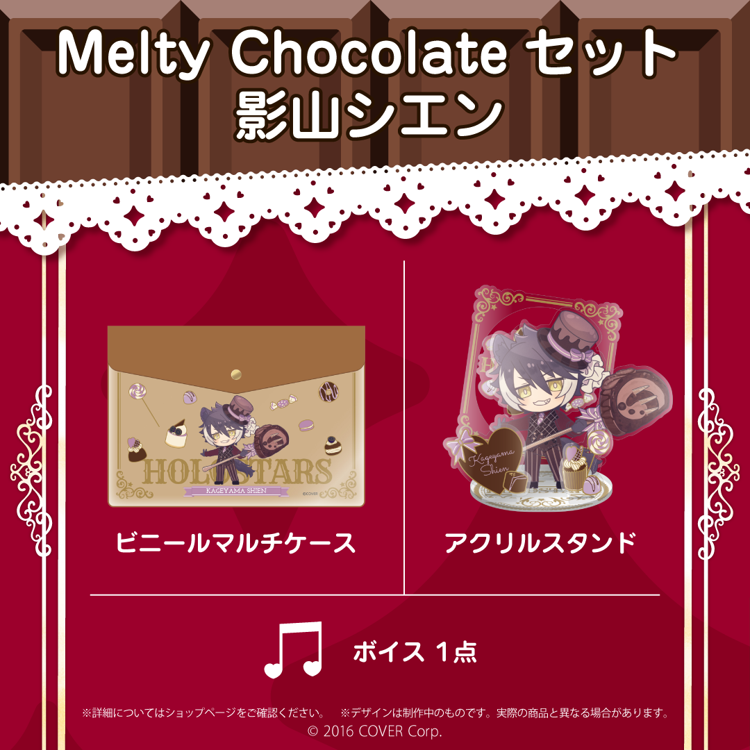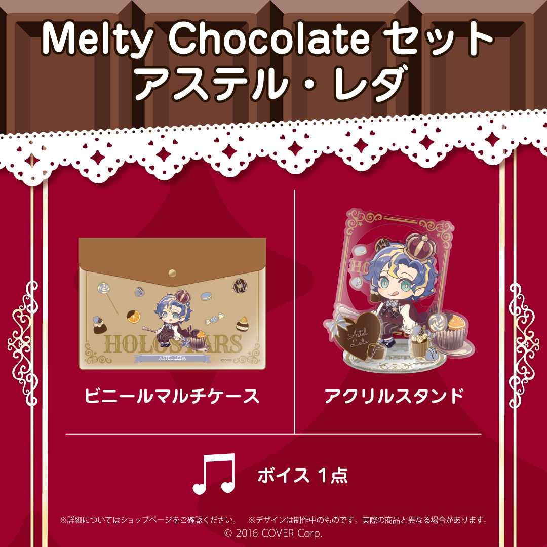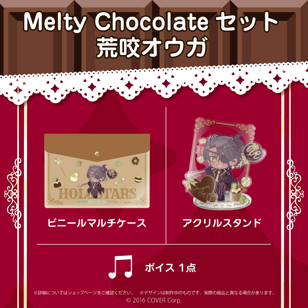 「Melty Chocolateセット」は、「みかんもち」先生描き下ろしのミニキャラクターイラストを使用したアクリルスタンドとビニールマルチケース、そして「ホロスターズ」の各メンバーが"あなた"と2人きりで過ごすバレンタインデーの1日をテーマにしたシチュエーションボイスの3点がセットとなっています。