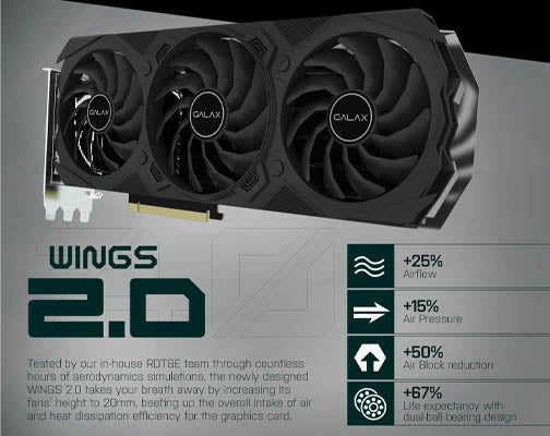 開発チームが数多くの空力シミュレーションを行い、新たに設計され、エアフローや空気圧の向上、エアブロックの削除など様々な効果を高めたオリジナル空冷ファン「WINGS 2.0」を搭載。