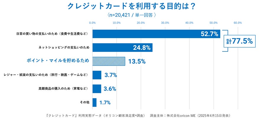 ■日常的な買い物が計77.5%と最多、一方「ポイント・マイルを貯める」目的の利用者も
