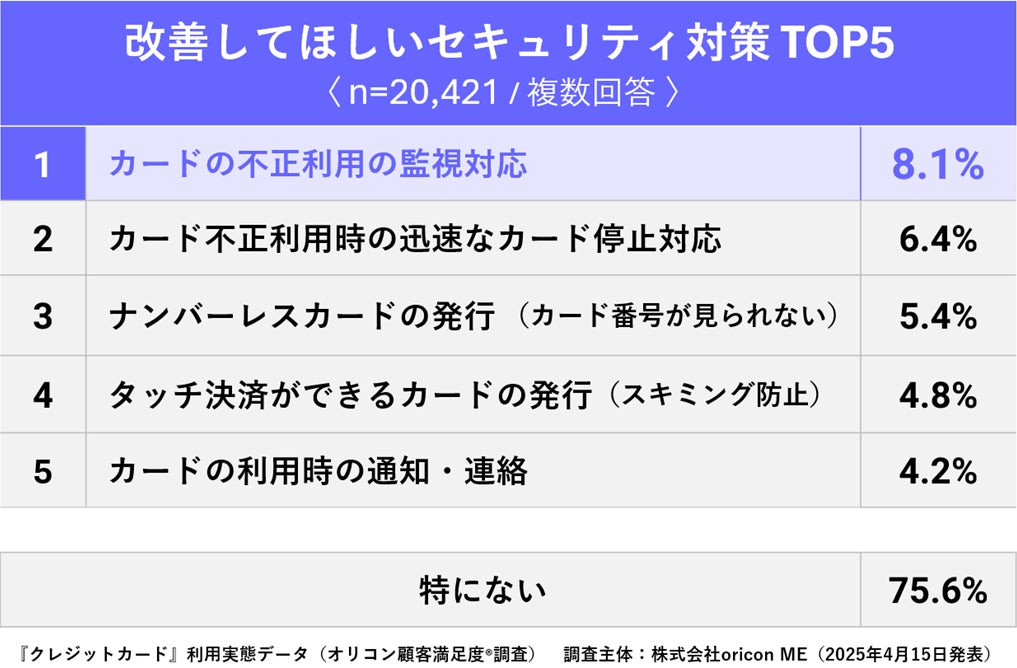 「改善してほしいセキュリティ対策(複数回答)」について聴取したところ、「カードの不正利用の監視対応」が8.1%で最多となり、次いで「カード不正利用時の迅速なカード停止対応」が6.4%とつづきました。
