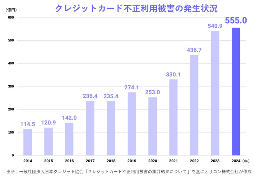一般社団法人日本クレジット協会が2025年3月7日に発行した「クレジットカード不正利用被害の集計結果について」によると、2024年のクレジットカードの不正利用被害額は555億円となりました。