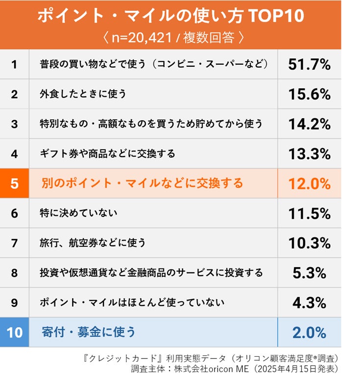 つづいて「ポイント・マイルの使い方(複数回答)」について聴取したところ、「普段の買い物などで使う(コンビニ・スーパーなど)」が51.7%で最多となっており、他の用途とは大きく差が開いています。