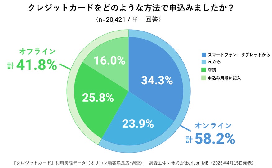 \ 実際の利用者20,421人が回答 /オリコン顧客満足度®調査 『クレジットカード』利用実態データ■申込み方法 オンラインでの申込みは計58.2% オフラインでの申込みは計41.8%
