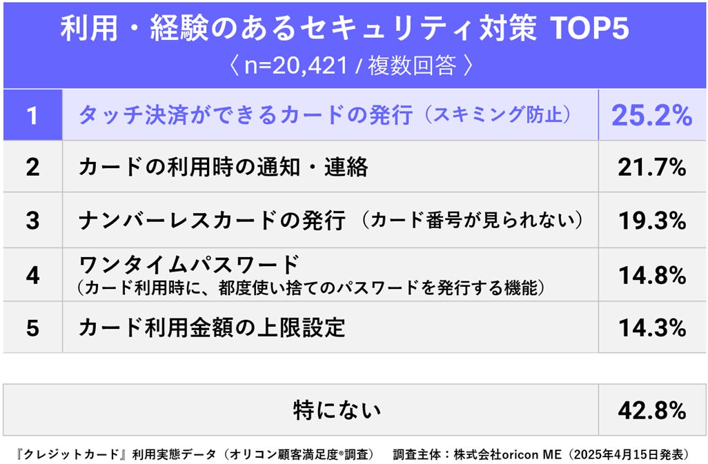 「利用・経験のあるセキュリティ対策(複数回答)」について聴取したところ、セキュリティ対策の利用・経験者では「タッチ決済ができるカードの発行(スキミング防止※)」が25.2%で最多となりました。