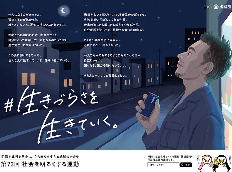 おいて⼒を合わせ、犯罪や⾮⾏のない安全で安⼼な明るい地域社会を築くための全国的な運動です。アドベンチャーワールドは、2020年より本運動の和歌⼭県推進委員会の構成団体として活動しています。本年は⻑引くコロナ禍で浮き彫りとなった“⽣きづらさ”を抱えつつも、⼈に頼り⽀えてもらいながら前を向いて⽣きていくという想いを込め、昨年に引き続き「#⽣きづらさを⽣きていく。」をキャッチコピーとしています。