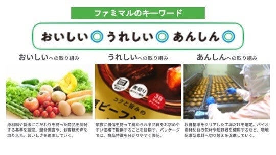 ファミマルのコンセプトは「ファミリークオリティ」。目指すのは大切な家族に安心してお薦めできる品質と安全性です。また、「おいしい◎うれしい◎あんしん◎」をキーワードに、お子さまからご高齢の方まで、誰にでもわかりやすい伝え方で、魅力を発信してまいります。