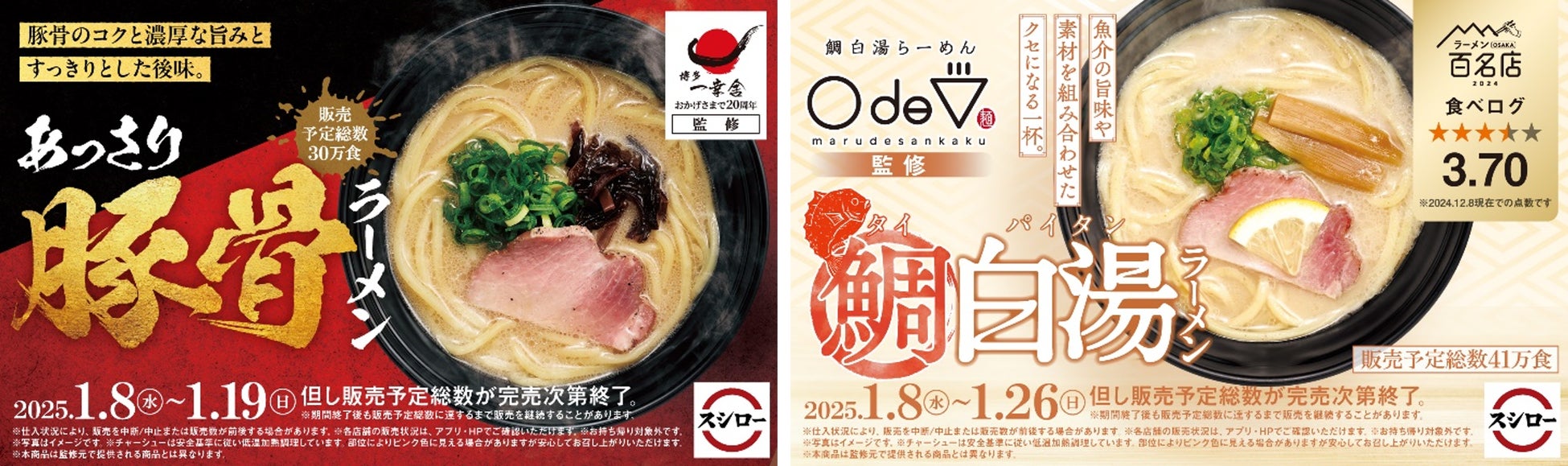 株式会社あきんどスシロー(本社:大阪府吹田市、代表取締役社長:新居 耕平)は、1月8日(水)より、日本三大ご当地ラーメンの一つである博多ラーメンの名店“博多一幸舎”監修の「あっさり豚骨ラーメン」と、「ラーメン OSAKA 百名店」に選出された大阪の名店“鯛白湯らーめん○de▽”監修の「鯛白湯ラーメン」を全国のスシローにて販売いたします。