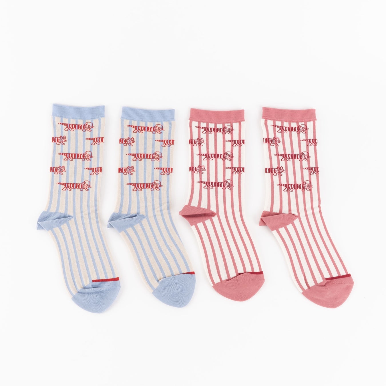 KID BLUEのシグネチャーテキスタイルの一つ、先染めの「KBストライプ」に、シマシマ模様の猫「マイキー」を組み合わせました。