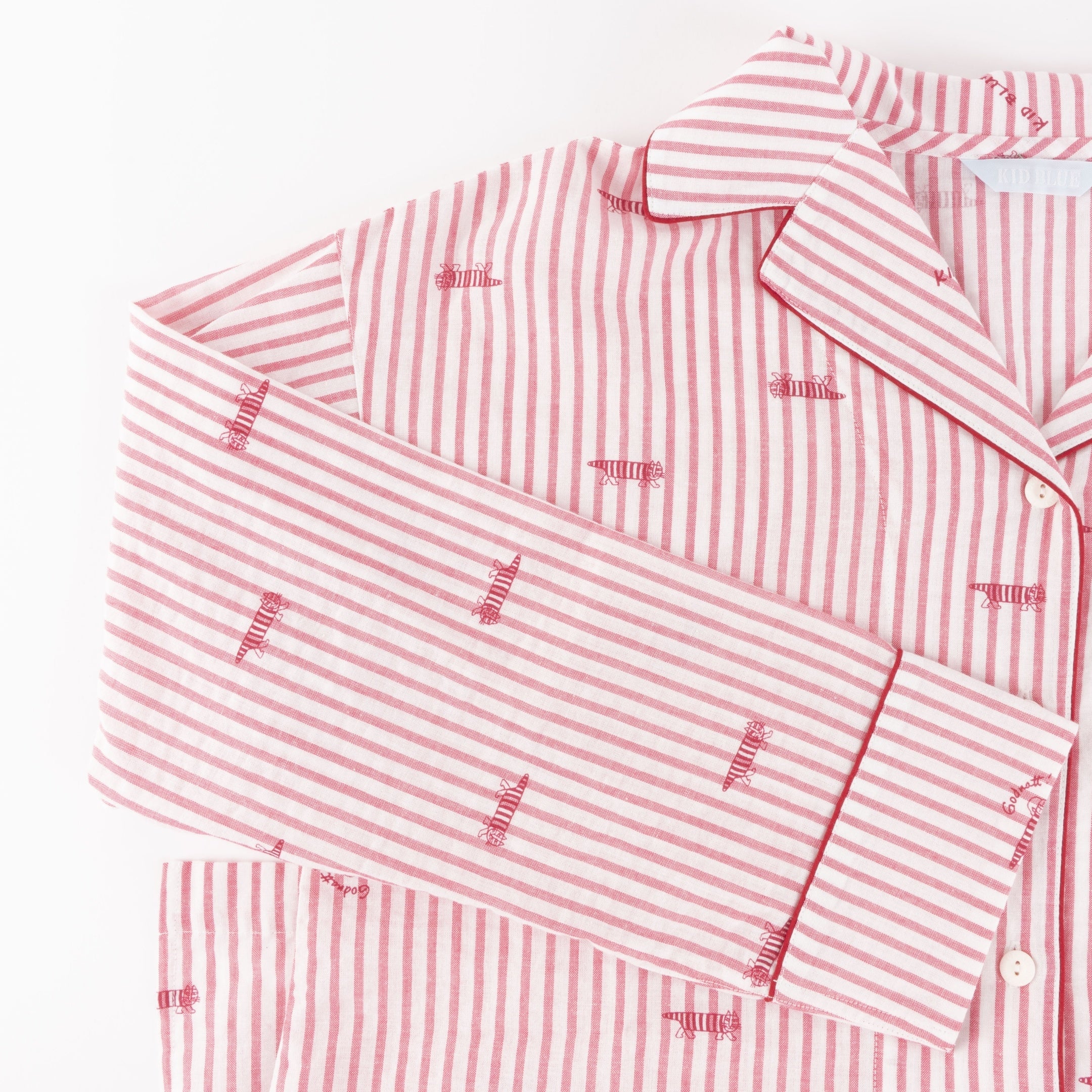綿とレーヨンの収縮差によって生地表面に小さな凹凸(畝)が生まれる素材は、通気性が良くさらりとした着心地が魅力。蒸し暑い夏の夜でも、どの年代の方にも快適に楽しんでいただける軽やかなシルエットに仕上げました。カラーは定番のサックスと、マイキーをイメージしたレッドの2色展開です。