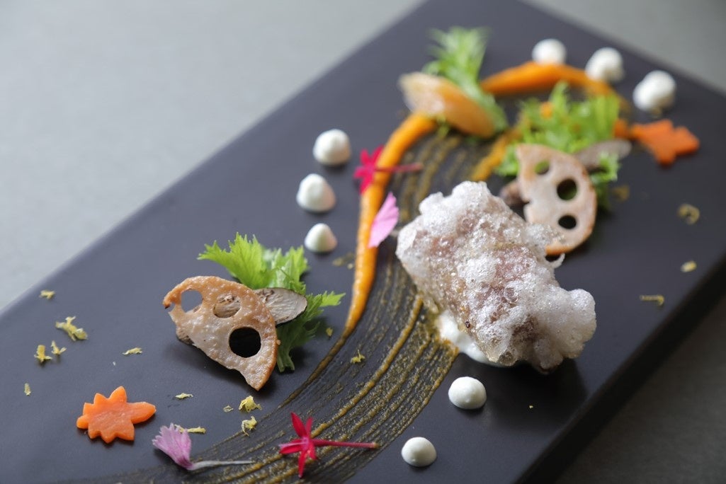 鮪は米と一緒に食べるイメージがあるので、ライスペーパーで巻いたベトナムの揚げ春巻き「ネム」から着想を得ました。秋の訪れを感じられるように、色とりどりの根菜で季節感を演出し、わさびクリームや湘南ゴールドのピューレなどご当地の味覚を添えています。
