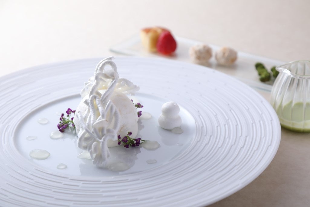 メイン食材の米に馴染がある「一汁三菜」をデザートで表現しました。クリームチーズにライスパフを加えたアイスの上に米のムースをのせました。抹茶のスープ「一汁」をかけたり、赤、黄、緑という「三彩」のプティフール(ひと口サイズのお菓子)で味の変化を楽しんでいただきます。