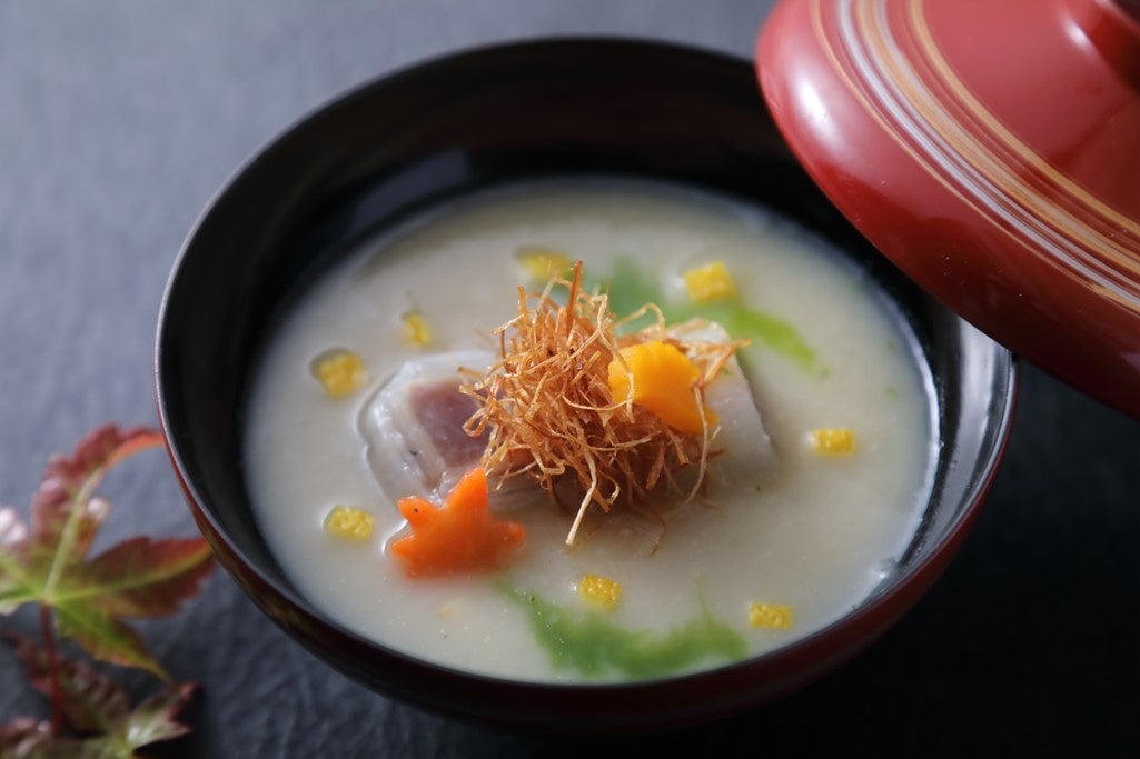 コメント:”生“でいただく鮪の美味しさを残しつつ、料理を提供予定の秋に、お客さまが温かく召し上がれる椀にしました。鮪のあらを無駄にせず、全て使い切るサステナビリティにもこだわりました。