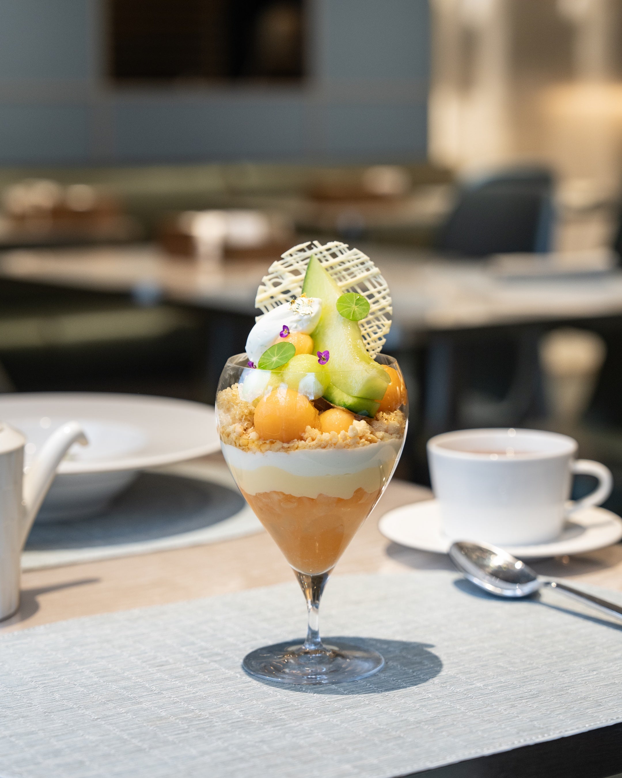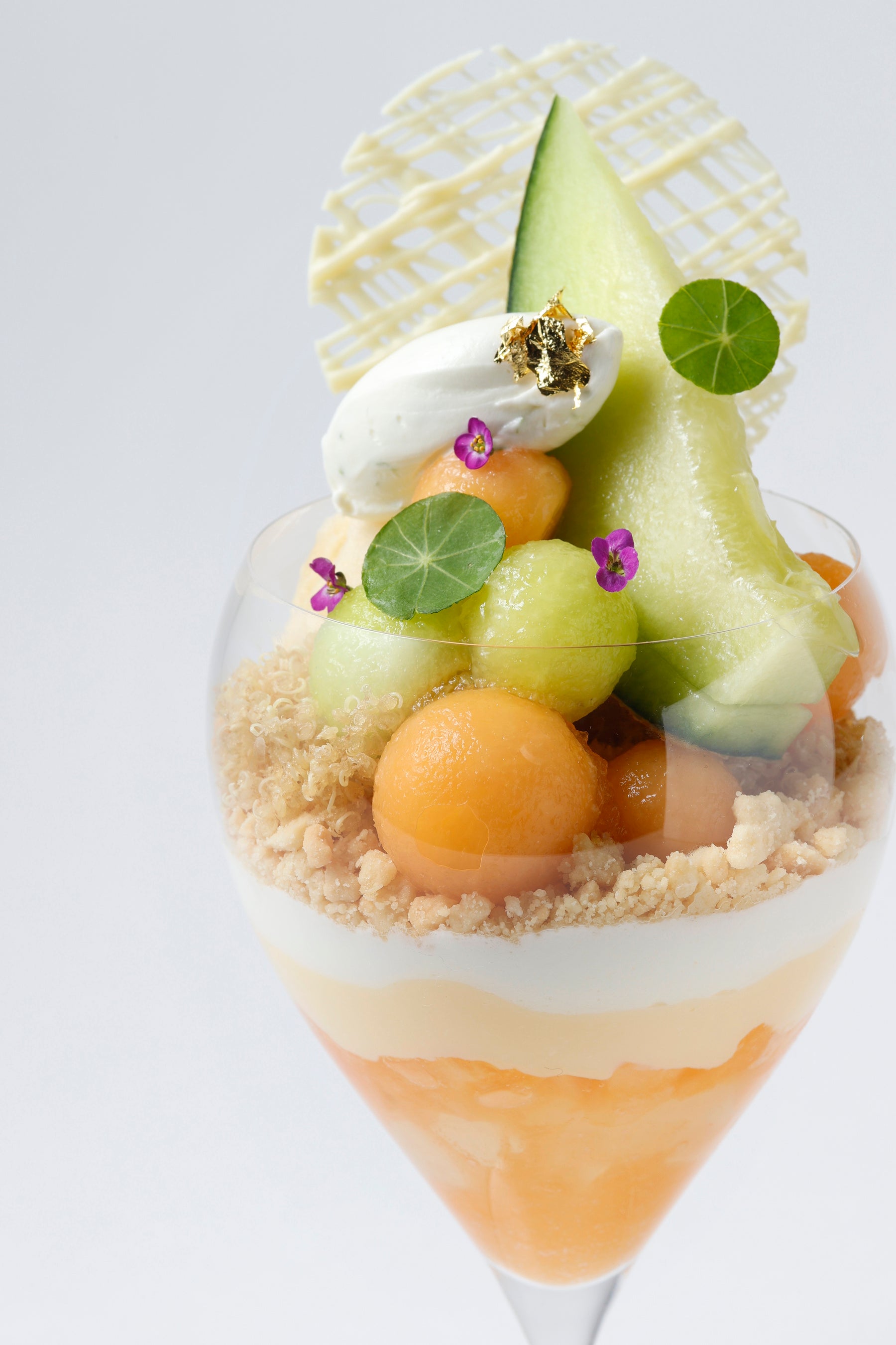 【アルマーニ / カフェ 表参道】2種類のメロンが奏でる、初夏の味覚。5月限定「メロン ジャスミン バジルのパフェ」