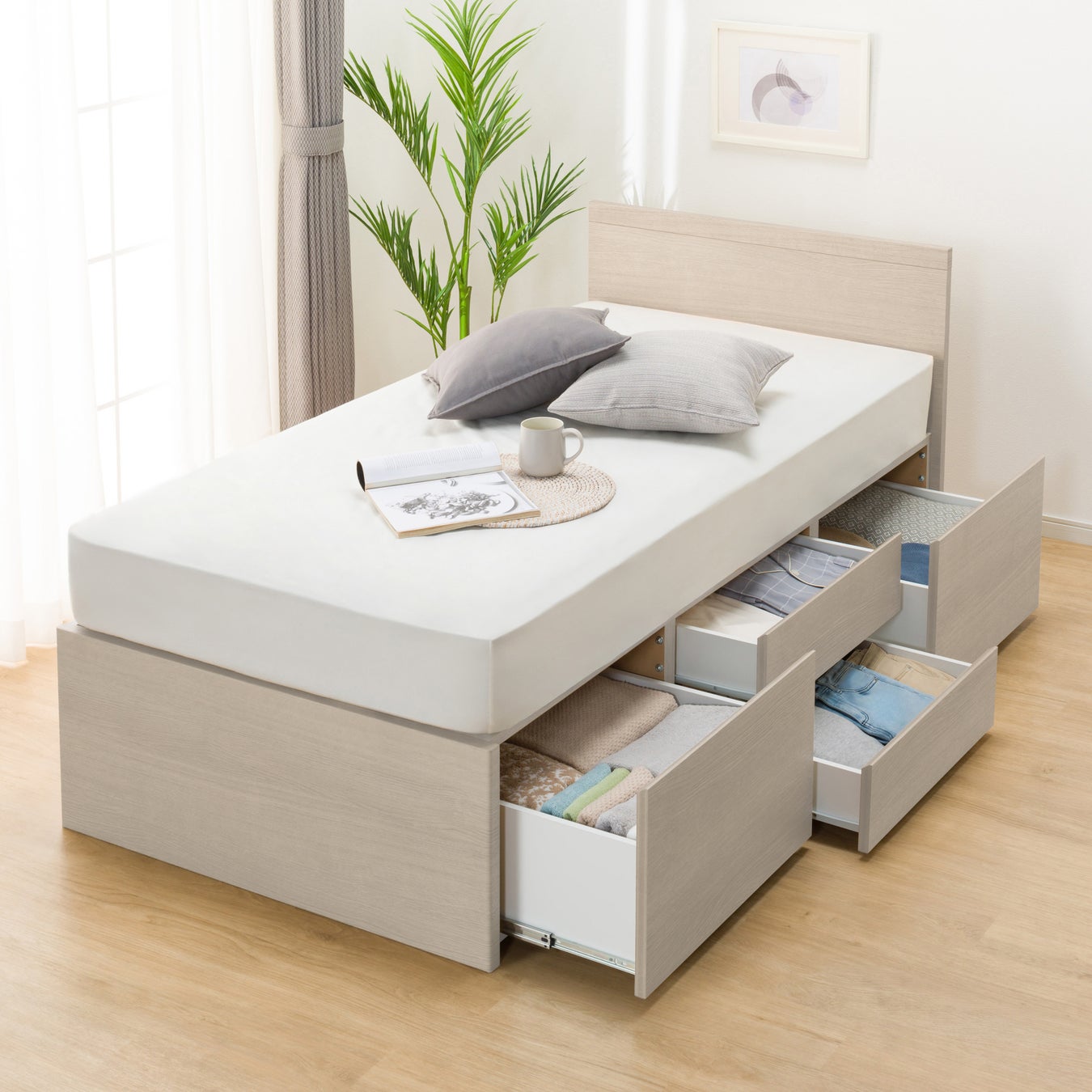 2023年に全世界で販売台数14万台を突破した大人気ベッドが記念祭価格で登場。人気の理由は、なんといっても大収納。衣装ケース12個分(ケース1個 幅40㎝×奥行55㎝×高さ25㎝の場合)の容量が引出しと床板下のスペースに入るから、タンス要らず。お部屋を広く、有効活用できるので、1人暮らし、子供部屋、夫婦の寝室などあらゆる用途に最適です。