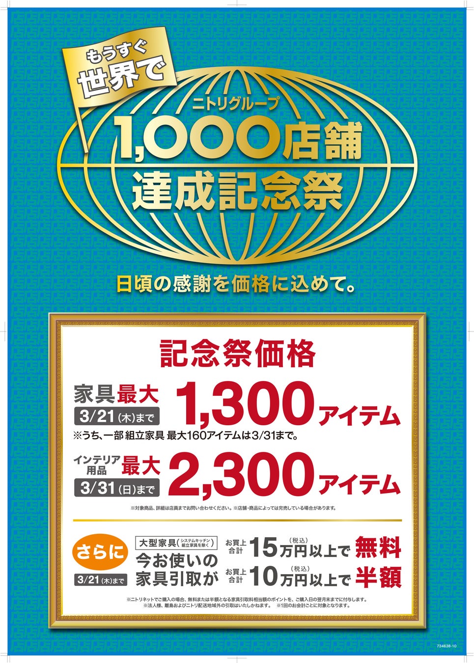 【ニトリ】2月17日(土)から記念祭価格商品が最大3,600アイテムに拡大!さらに、家具引取サービス料金もお得に。「もうすぐ世界で、グループ1,000店舗達成記念祭」絶賛開催中