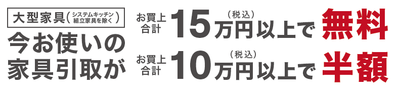 さらに、大型家具(システムキッチン・組立家具を除く)合計15万円(税込)以上のご購入で、今お使いの家具の引取サービス料金通常価格4,400円(税込)が無料、合計10万円(税込)以上のご購入で半額でご利用いただけます。