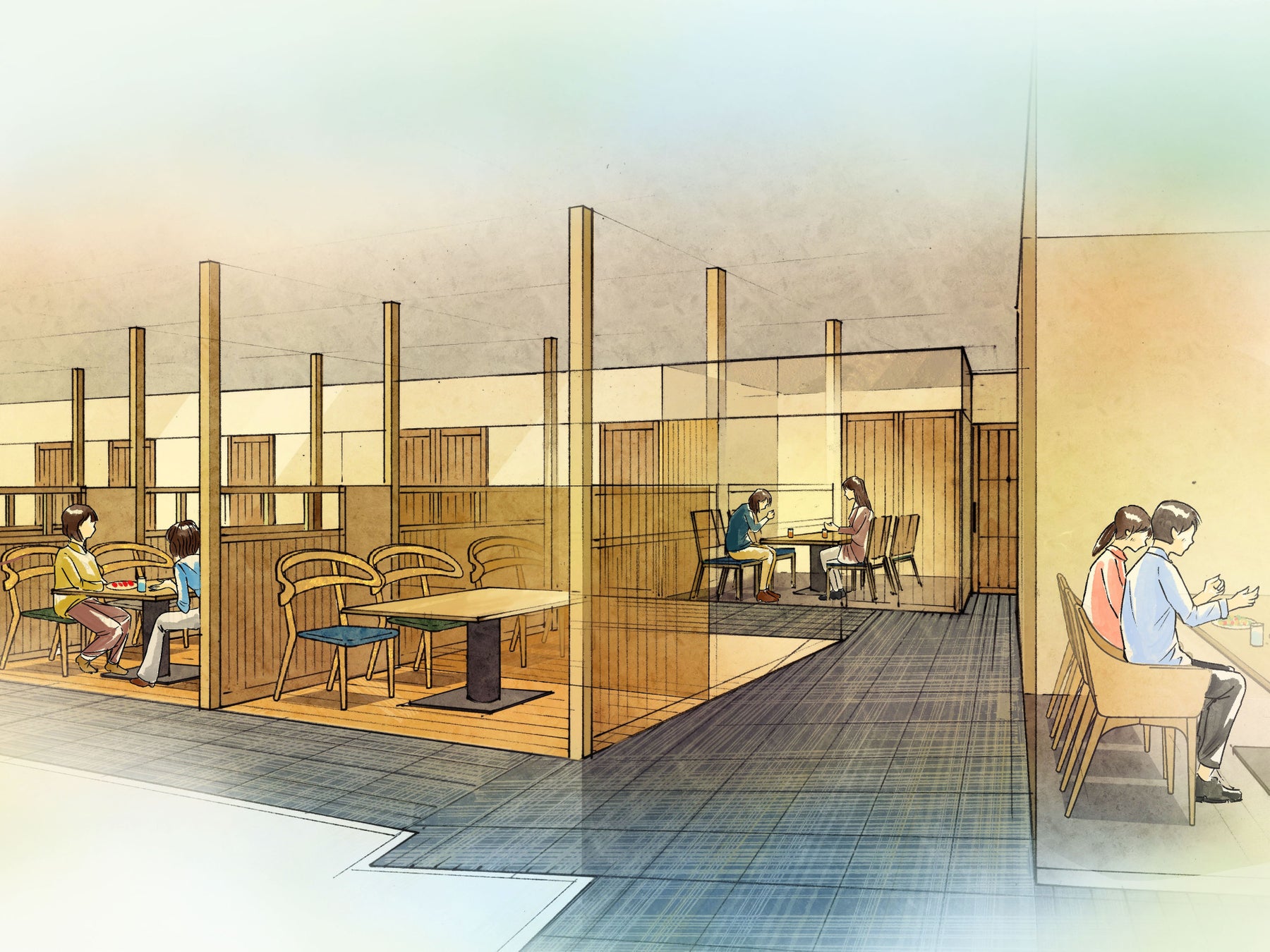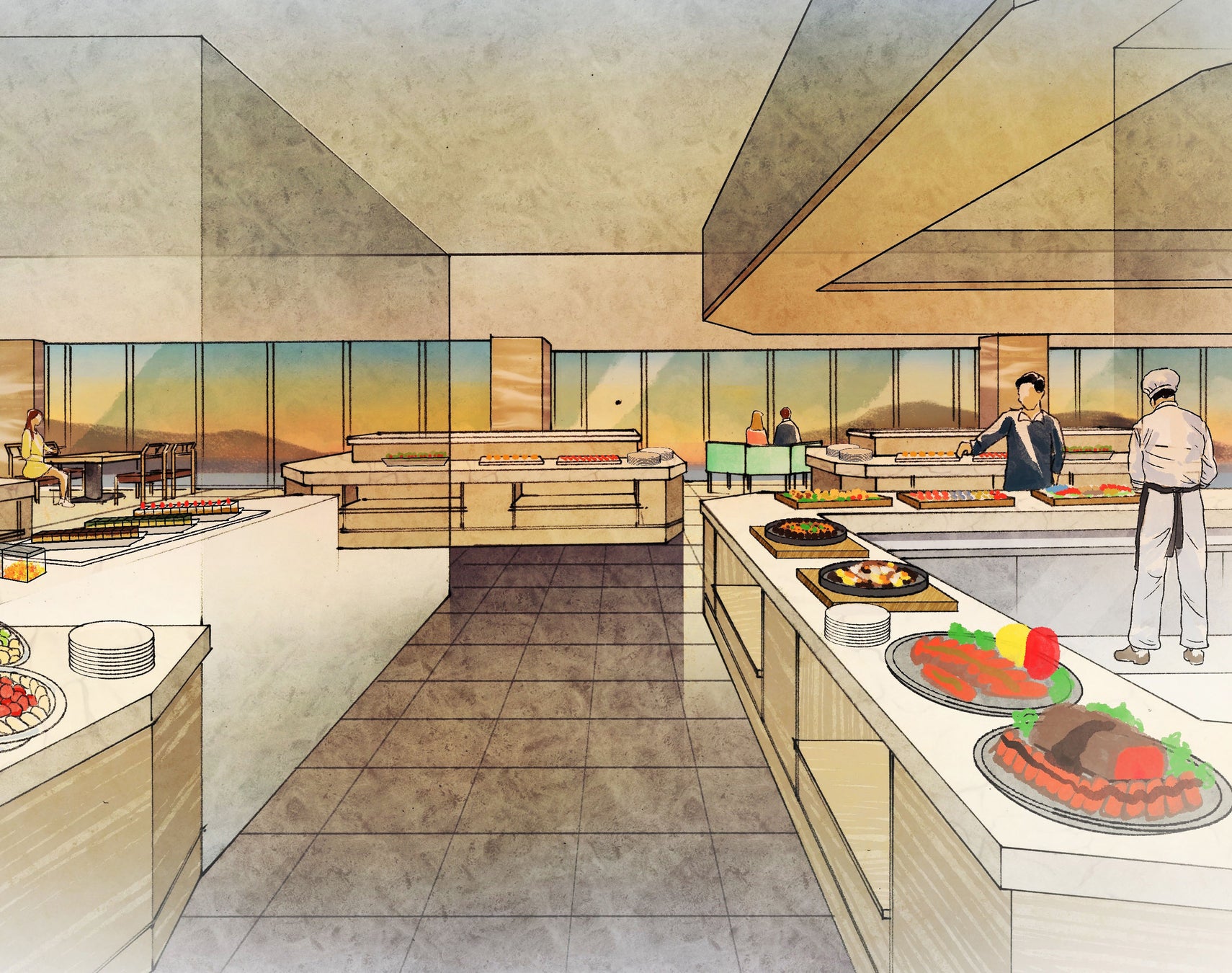 新設する約11mのオープンキッチンには、ライブ感あふれる出来立てのお料理や、鯛やカンパチなど新鮮なお刺身、お寿司、天麩羅などがずらりと並びます。