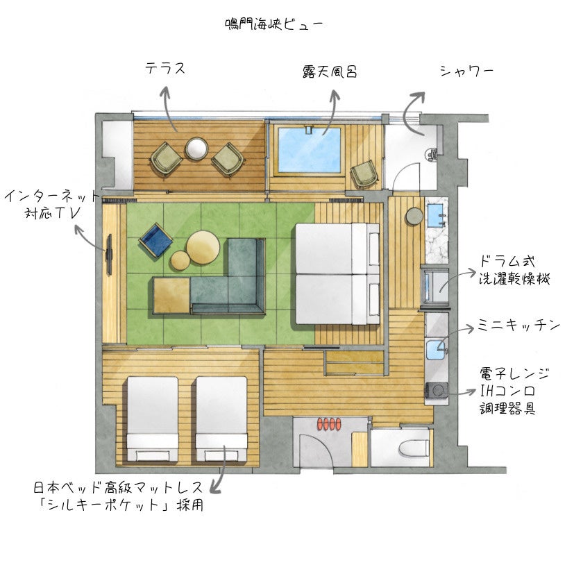 ベッドは、日本ベットのシルキーポケットマットレスを採用。動画配信サービス対応のテレビ、シャワーブース、ドラム式洗濯乾燥機やIHコンロや電子レンジ、調理器具付きのキッチンも完備し、長期滞在にも対応。昼は青い海と空、夜はライトアップされた鳴門大橋の幻想的な景色を眺め、潮風を感じながら、贅沢な空間がお楽しみいただけます。