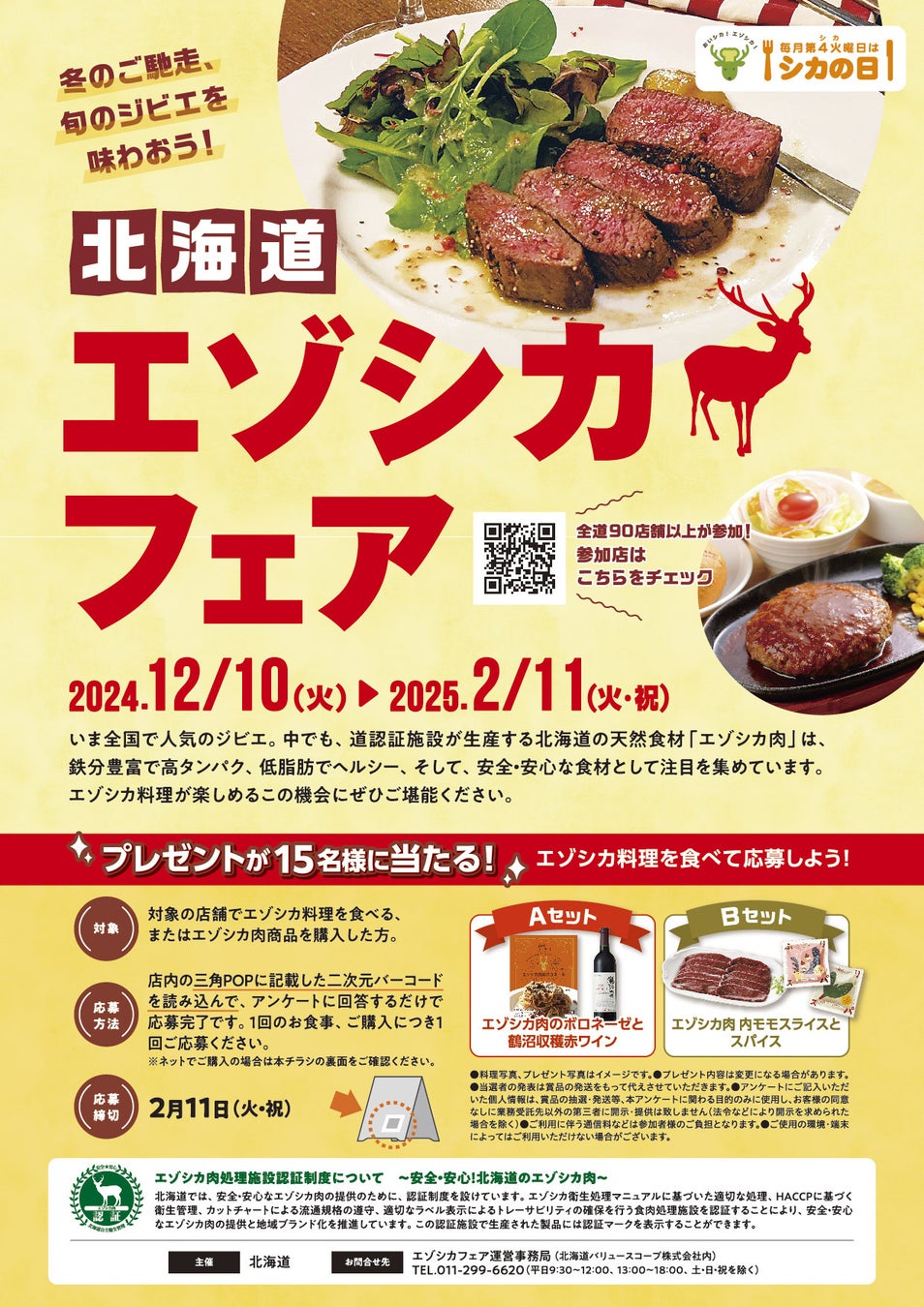 加店でエゾシカ料理を食べたり、エゾシカ肉を買うとエゾシカ肉商品等のプレゼントに応募できます。