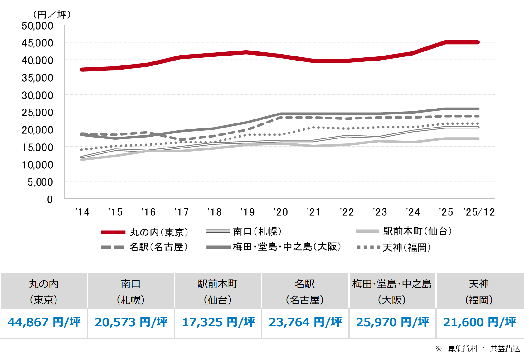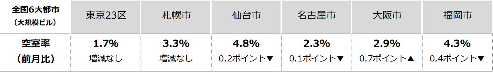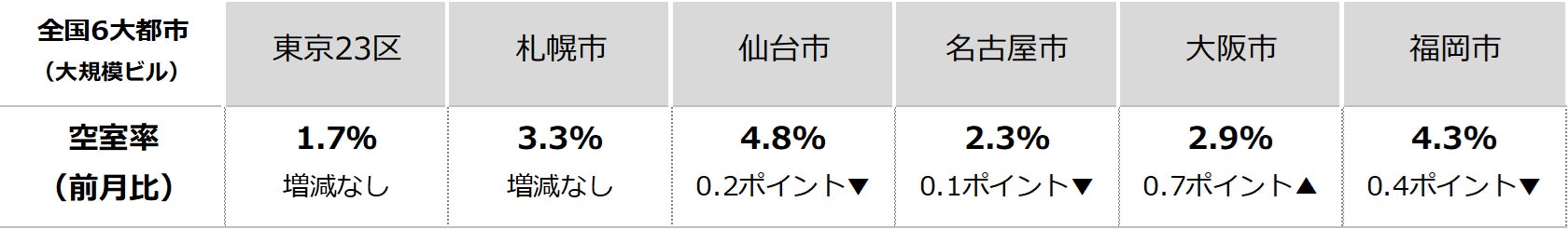 三幸エステート株式会社(本社:東京都中央区、取締役社長:福島正二郎)は、2025年12月度の東京都心5区(千代田区、中央区、港区、新宿区、渋谷区)および全国6大都市(東京、札幌、仙台、名古屋、大阪、福岡)の大規模ビル※1のマーケットデータをまとめた「オフィスマーケット2026年1月号」を公表します。