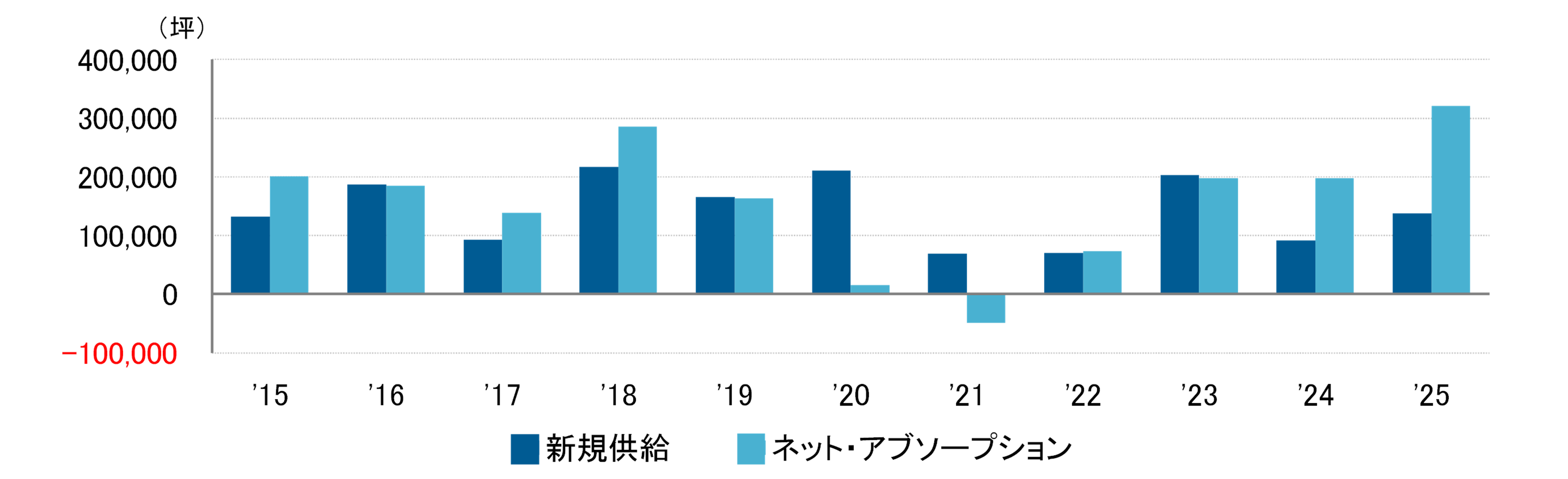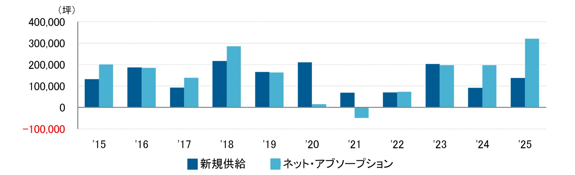 2025年の吸収需要は約32万坪と2004年以来で30万坪を超え、2000年以降の最大値を記録した。オフィス需要が非常に強く、既存ビルの募集床は品薄となっている。2026年の新規供給は約16万坪の見込みだが、多くの建築中ビルが既に高い内定率となっており、吸収需要のより一層の伸びは見込みにくい状況にある。(市場調査室 今関豊和・津田宏美)