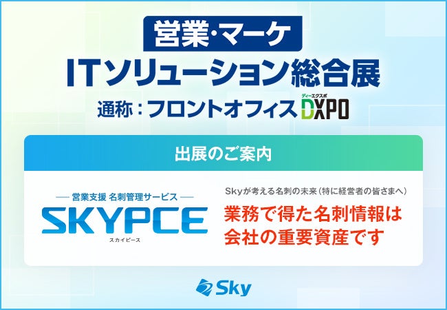 Sky株式会社は、2023年3月16日(木)・17日(金)にインテックス大阪で開催される、業務効率化・生産性向上・DX推進のためのIT製品が集結する「第1回【営業・マーケ】ITソリューション総合展 大阪'23(通称:フロントオフィスDXPO)」に出展します。