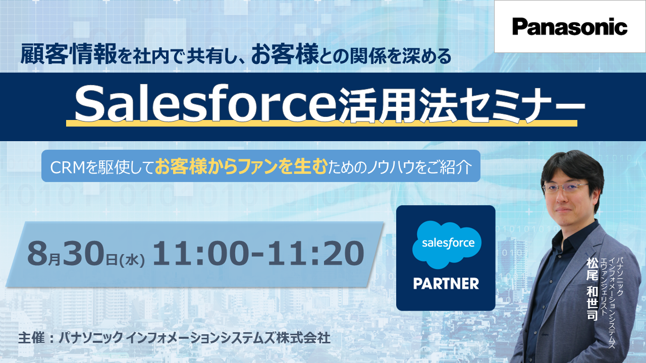 パナソニック インフォメーションシステムズ株式会社は、2023年8月30日(水)に、『顧客情報を社内で共有し、お客様との関係を深めるSalesforce活用法セミナー』を開催します。