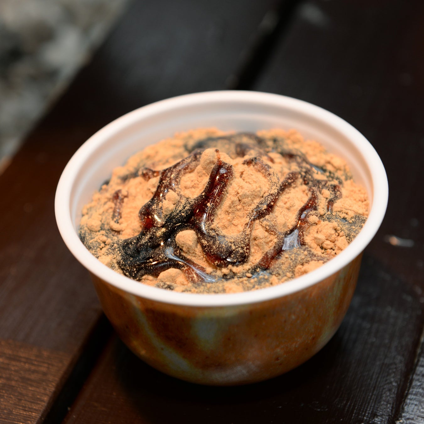 川崎大師・仲見世通りに直営店を構え、わらび餅の製造販売。昔ながらの製法にこだわり、銅釜でじっくりと練り上げた、独自の粘りと食感を持つわらび餅。ラインナップは国産皮剥き深煎りきなこを使用した、プレーン味の「きなこ」。国産本抹茶を生地ときなこに和えた「抹茶」。生地に食用竹炭、きなこに黒ごまを和えた「黒ごま竹炭」の3種類をご用意。