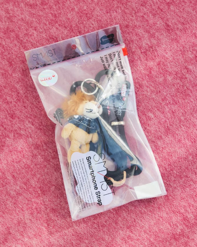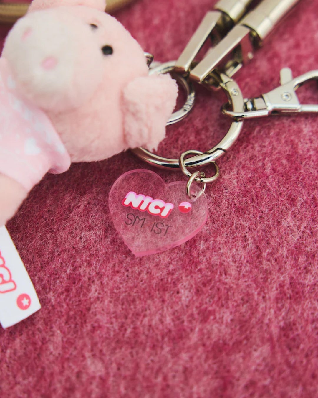 NICI x SMASTのオリジナルハートチャーム、アタッチメント付きで、ストラップにチャームとしてぶら下げるのももちろん、バッグにチャームとして付けるのもおすすめです。NICIのぬいぐるみに巻いているバンダナは、首に巻いたり、頭に巻いたり、様々にアレンジしても楽しめます。